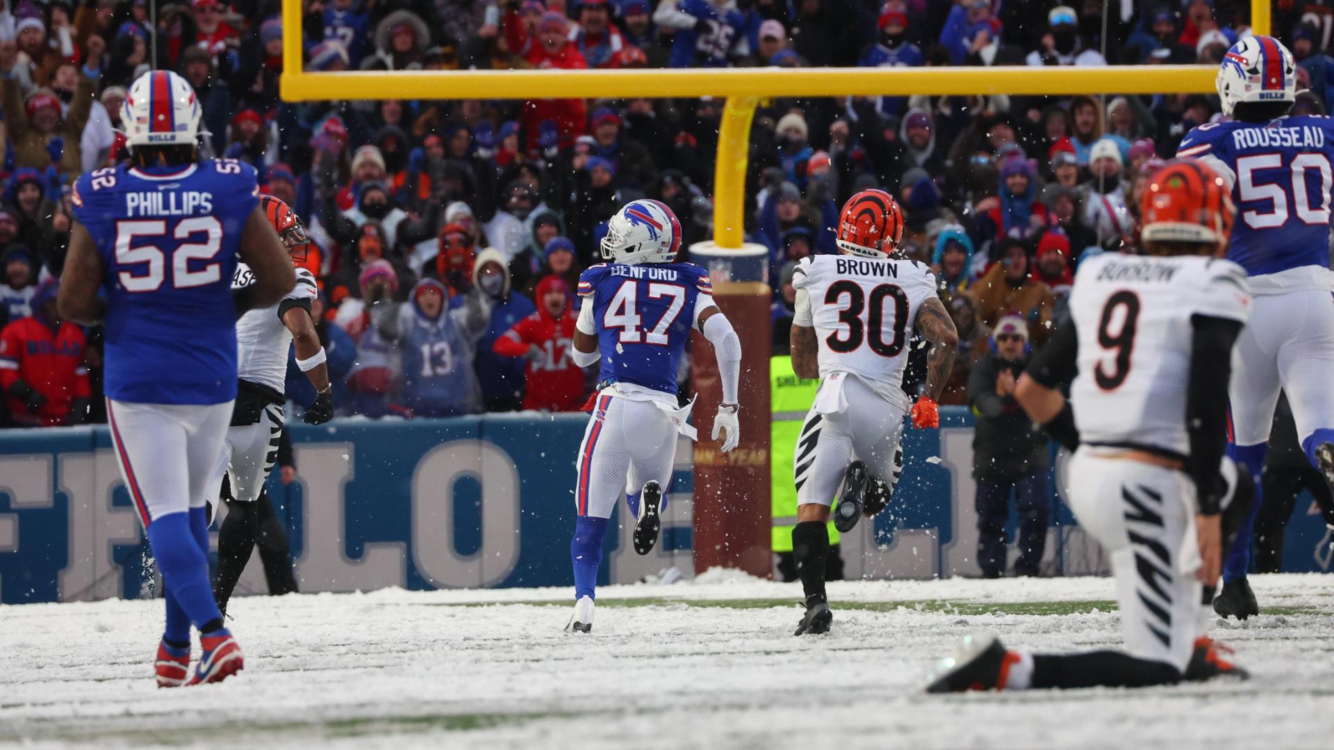 Foi de Allen um dos lances que mudaram o rumo da partida: um touchdown corrido de 40 jardas, batendo mais um recorde da franquia, seguido por uma pick six de Christian Benford. O cornerback, que já vinha fazendo uma partida sólida apesar das condições do gramado, fez a jogada da noite ao saltar a rota, interceptar o passe de Burrow e retornar para um touchdown que quebrou completamente o ritmo ofensivo dos Bengals.